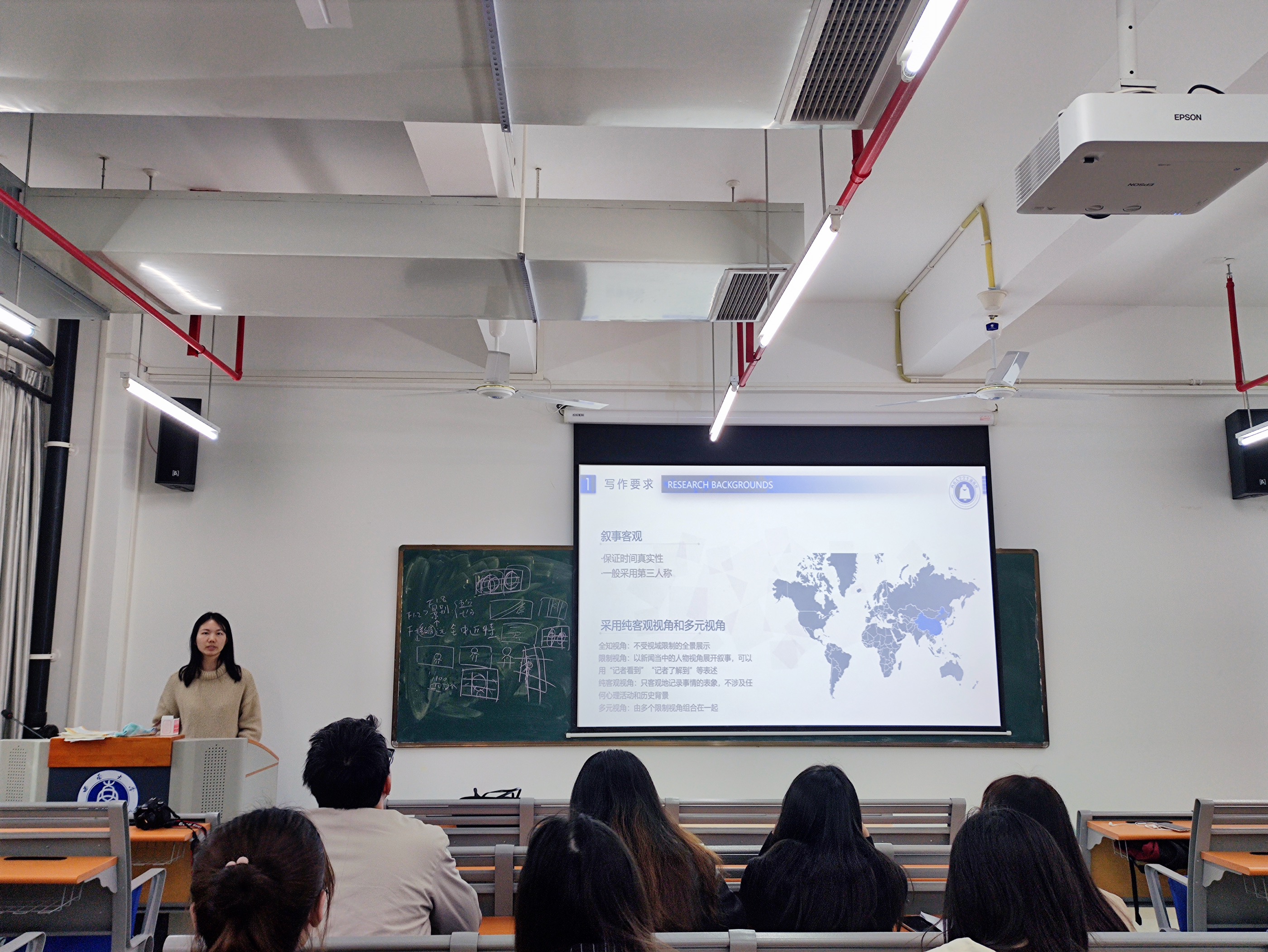 活动伊始,邬洁妤同学为大家分享了拍摄会议发言人照片的经验技巧,比如把握拍摄时机,背景需干净,使用连拍,多拍优选。着重强调“一张照片的好坏,取决于照片是否和谐以及人物是否好看”。随后邬洁妤同学介绍了相机的光圈,快门速度和感光度,并现场用相机拍摄,给同学们演示了如何选择相机的参数。最后她还为同学们讲解了基础构图知识,并采用了生活中拍摄的一些照片进行对比分析,让大家更加直观地领会构图的重要性与技巧性。