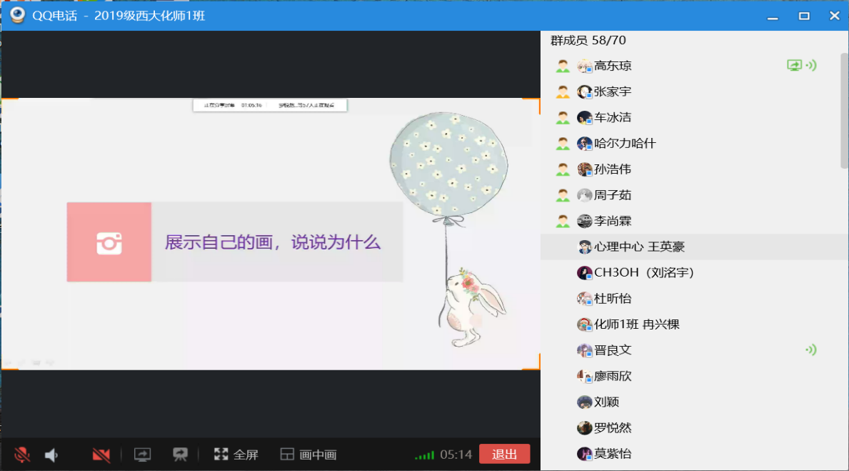 2020年4月24日,由心理中心策划主办的首次线上心理团辅活动在2019级化师一班同学们的参与下顺利举行。此次团辅活动的主题为“窥庐山面目,觅心中形容”,通过屏幕分享的方式在19级化师1班的班级群中进行,旨在鼓励同学们敢于分享自我,加深同学之间的相互了解。