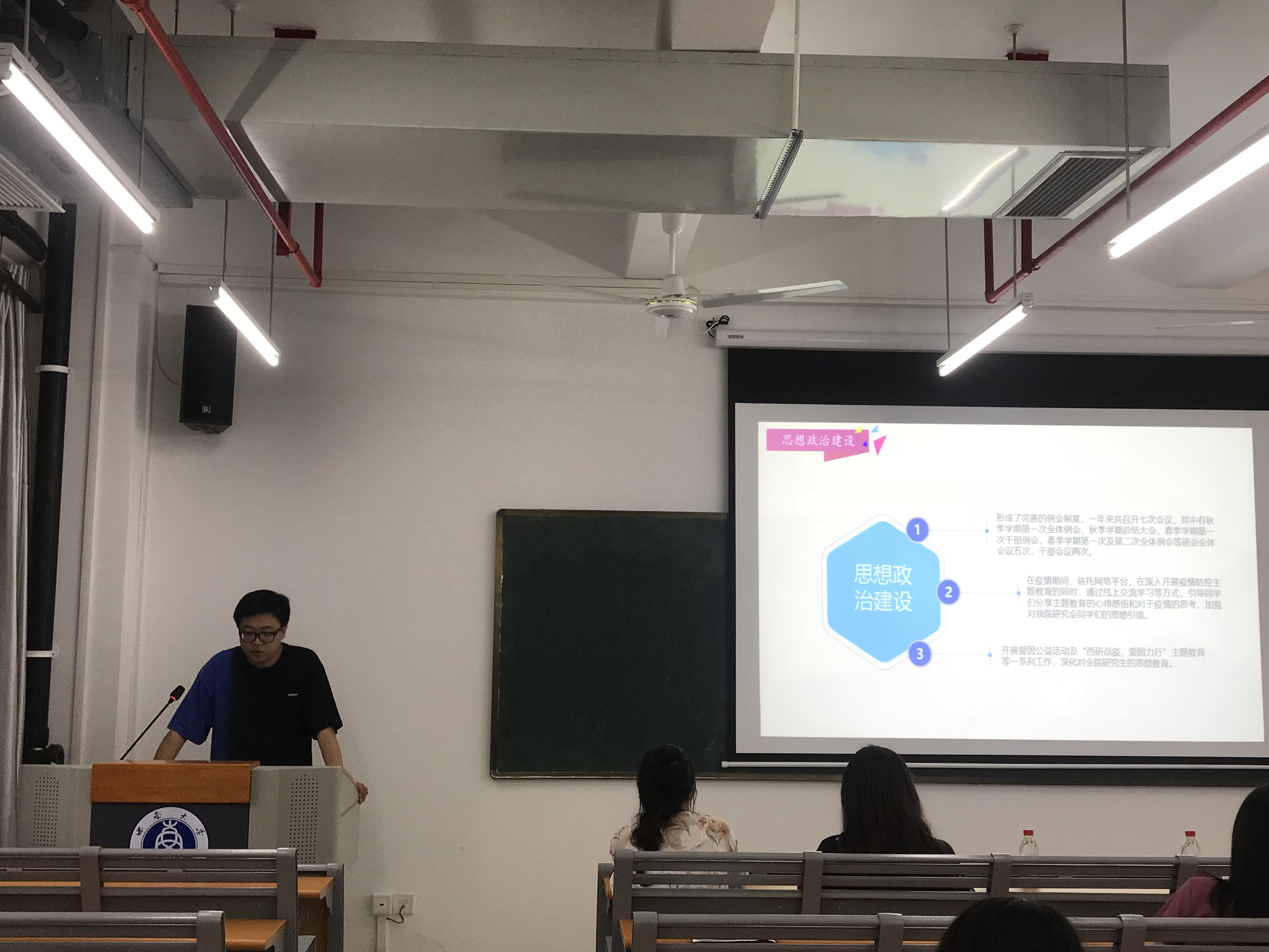 会议伊始,研究生会主席赵晋文用ppt对上一年的工作进行了展示并作了简要总结和研会展望。在过去的一年中,有很多值得学习的优点,但也存在些许不足,有待在以后的工作中不断改进,取得长足的发展。