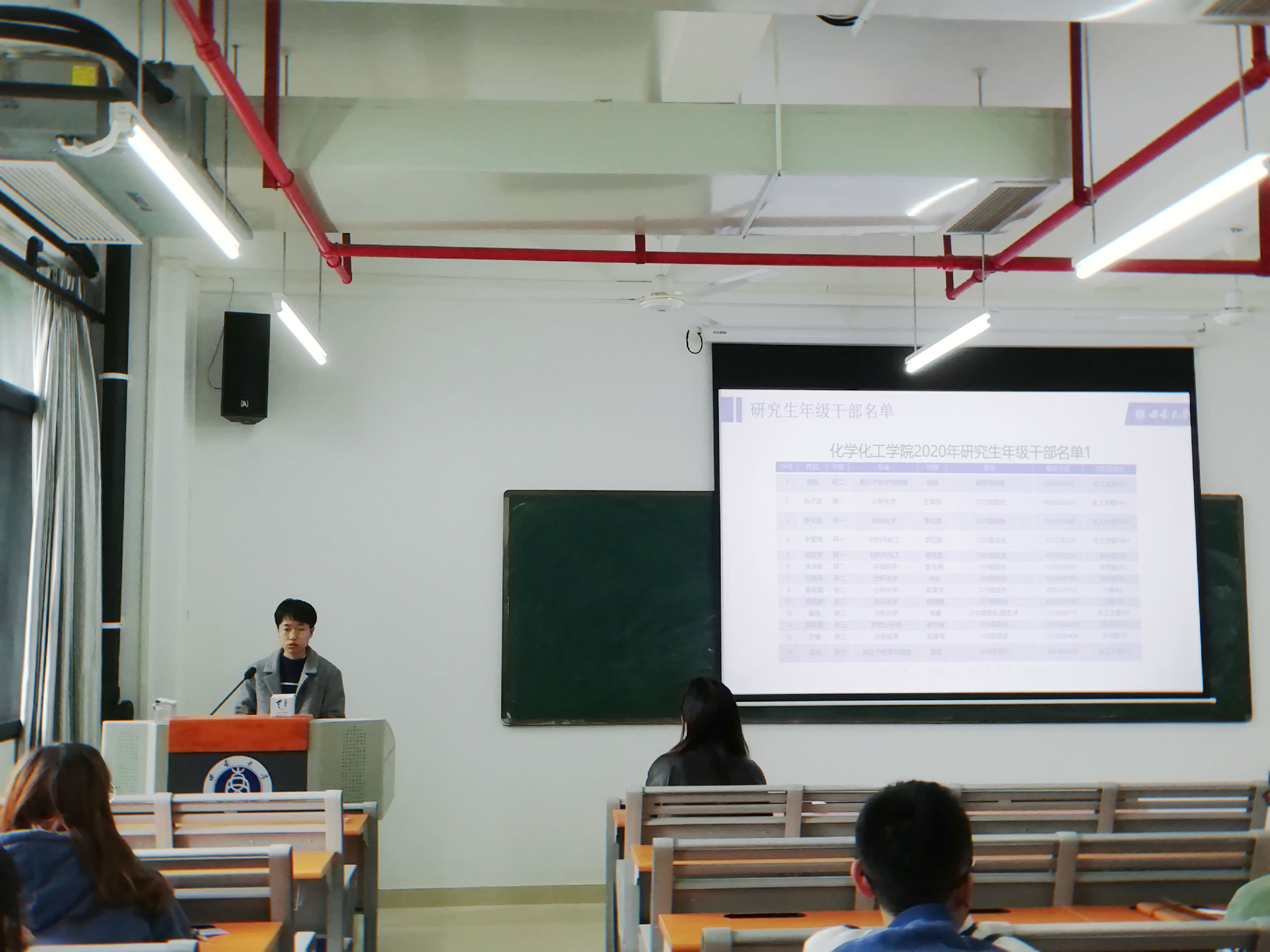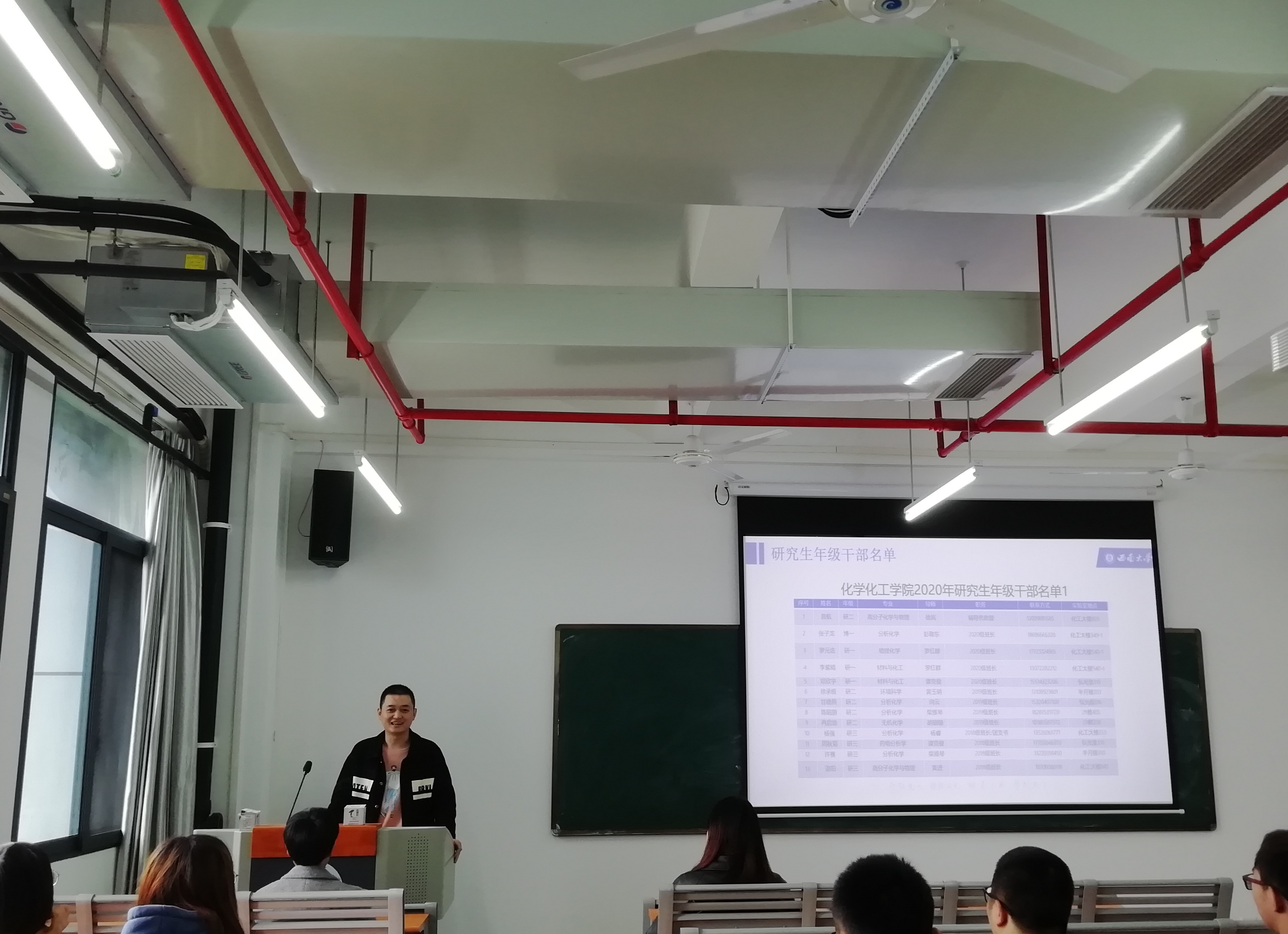 第二部分,辅导员助理普航同学对自己近期工作进行汇报,并表示期待接下来与各位研究生会干部们共同协作,一起协助杨思清老师把学生工作处理得仅仅有条。各年级班长对近期工作进行了总结与反思:一是传达相关信息时,做到准确无误、通俗易懂。二是处理学生工作时,要分工明确,有条不紊。三是接到上级文件时,要仔细研读文件细节,弄清每一项条款。团支书以及各实验室负责人进行简要自我介绍,学习并总结其他同学的工作经验,为今后更好地协助老师开展学生工作做好充分的准备。