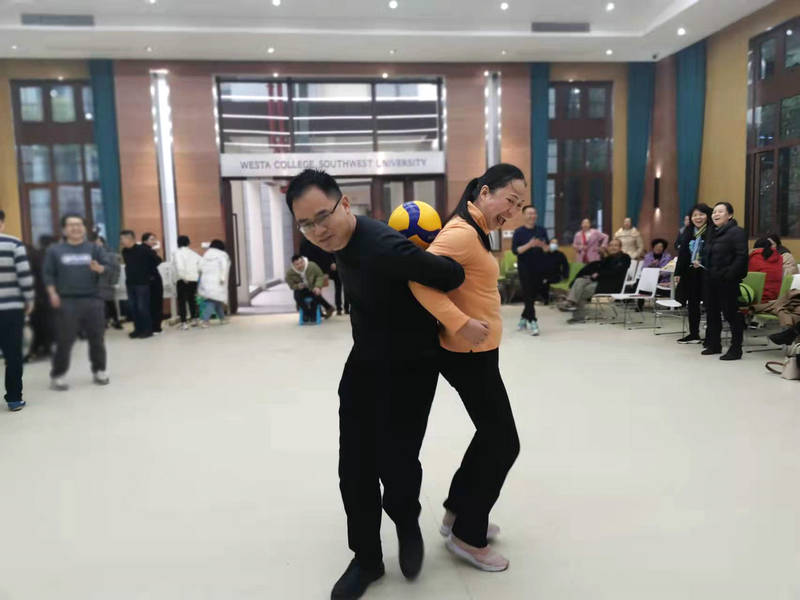 “心心相印螃蟹接力“比的是两个人的协调同步能力,比赛过程中有球掉落的,有动作不一致的,甚至还有摔倒在地的。周围老师们不时发出惊呼声,加油声以及开心的笑声。
