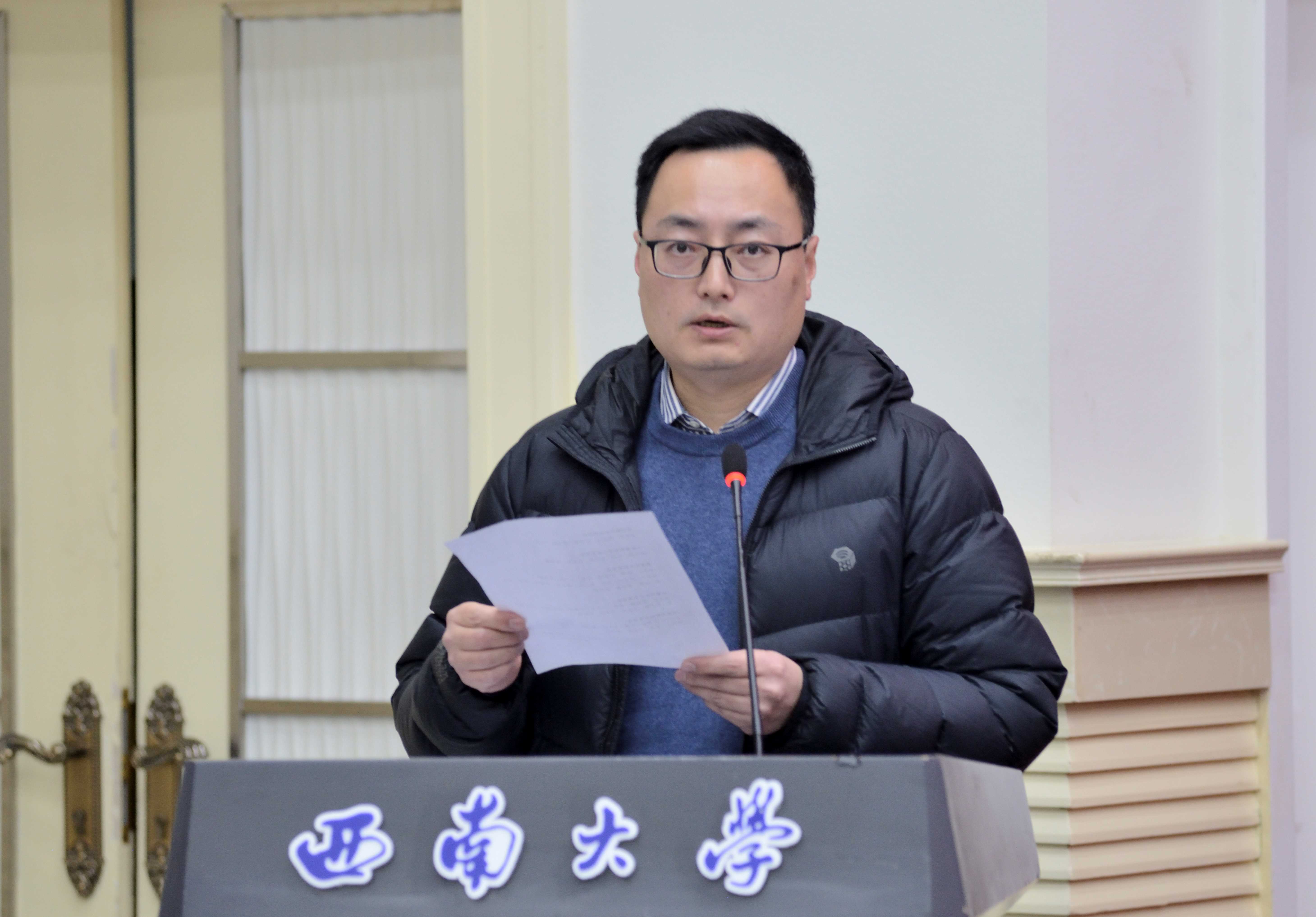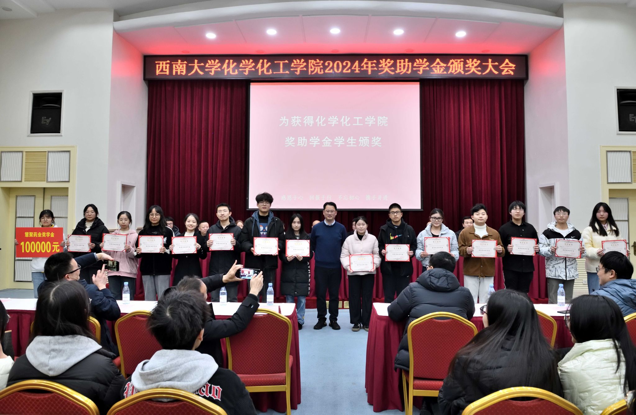 12月20日下午,化学化工学院2024年奖助学金颁奖大会在西南大学桂园宾馆金桂厅隆重举行。西南大学对外联络办公室副主任、教育基金会副秘书长、校友会副秘书长陈建英、1996级校友,江苏慧聚药业股份有限公司总裁邹平、研究生2006级校友,长江材料研发中心研发主任王丽峰、1990级校友,重庆浩力环境影响评价有限公司董事长康林、1995级校友,聚慧食品科技(重庆)有限公司董事长苟中、广州慧谷新材料科技股份有限公司项目总经理郑海庭、重庆博腾制药科技股份有限公司人力资源高级主管夏思茗、2009级校友,木质素重庆科技有限公司董事长黄兴亮及学院全体班子成员出席本次颁奖大会。会议由夏德全主持。