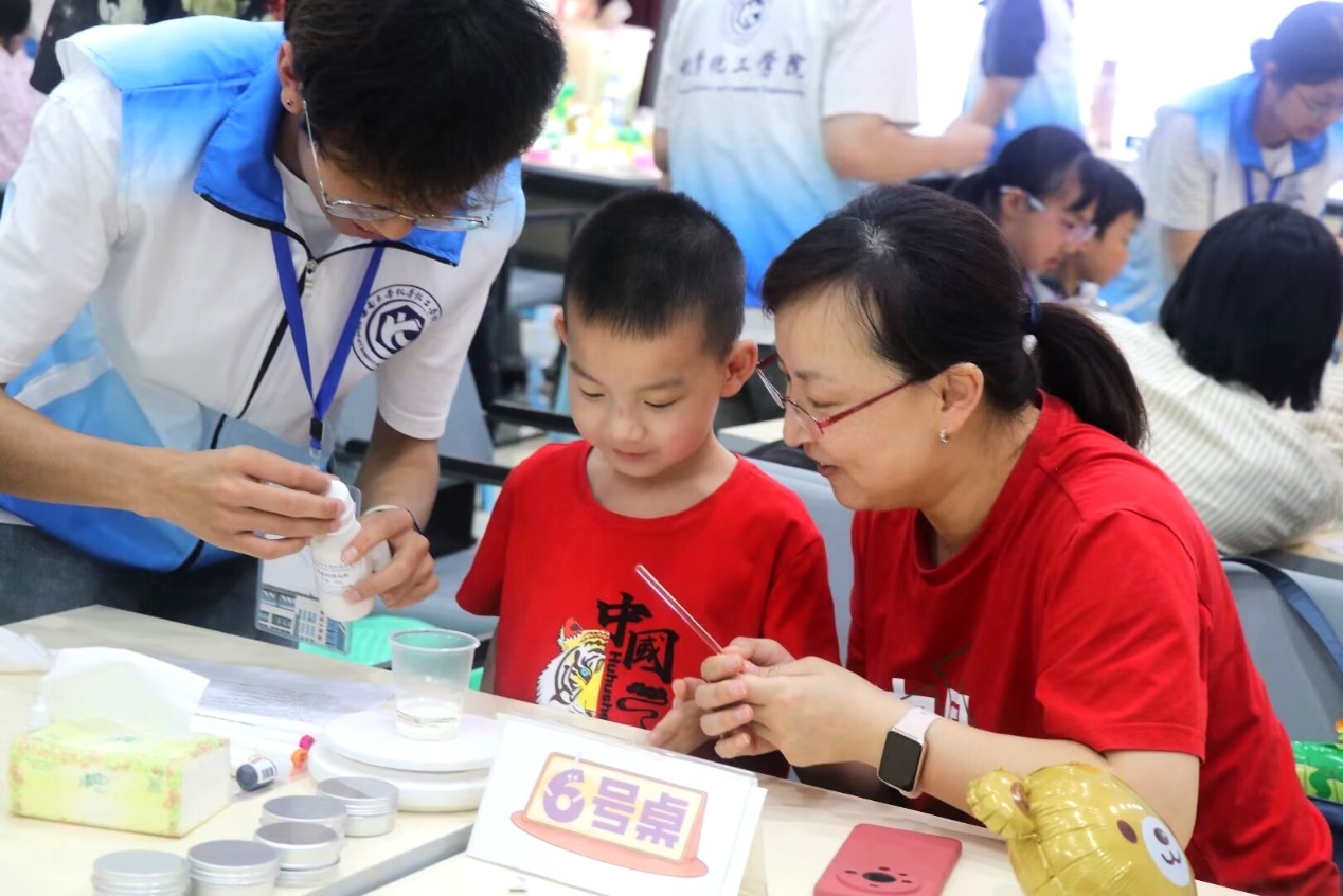 “哇!”这是从B320活动室传来的小朋友们的惊叹声。一路跟随志愿者的指引,来到布置充满童趣的“趣味实验”现场。“魔术师”手中的茶水由“晴”转“乌云”,再转“晴”,让孩子们目瞪口呆。