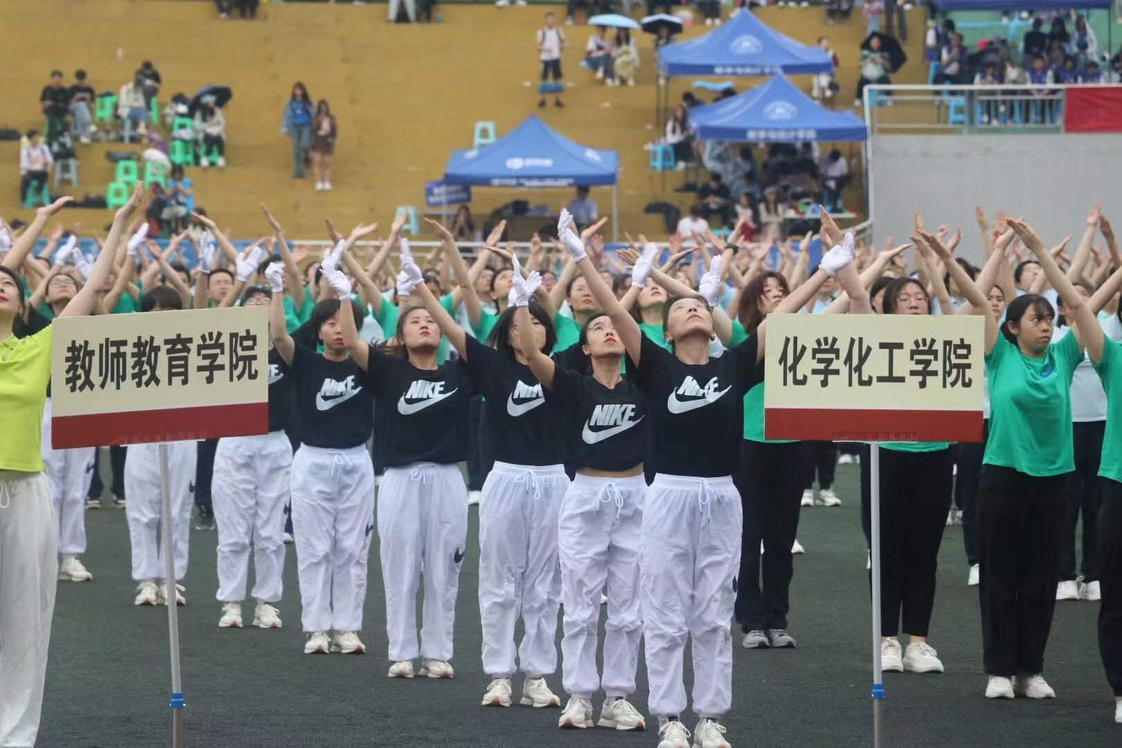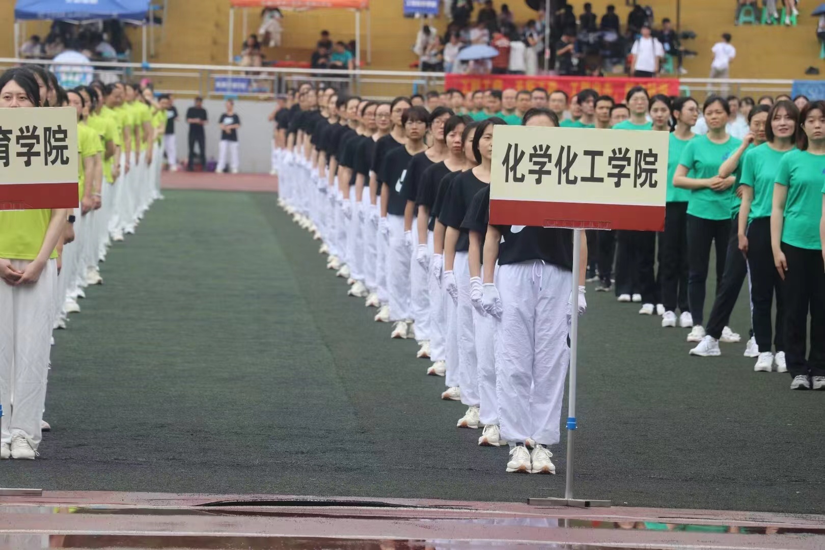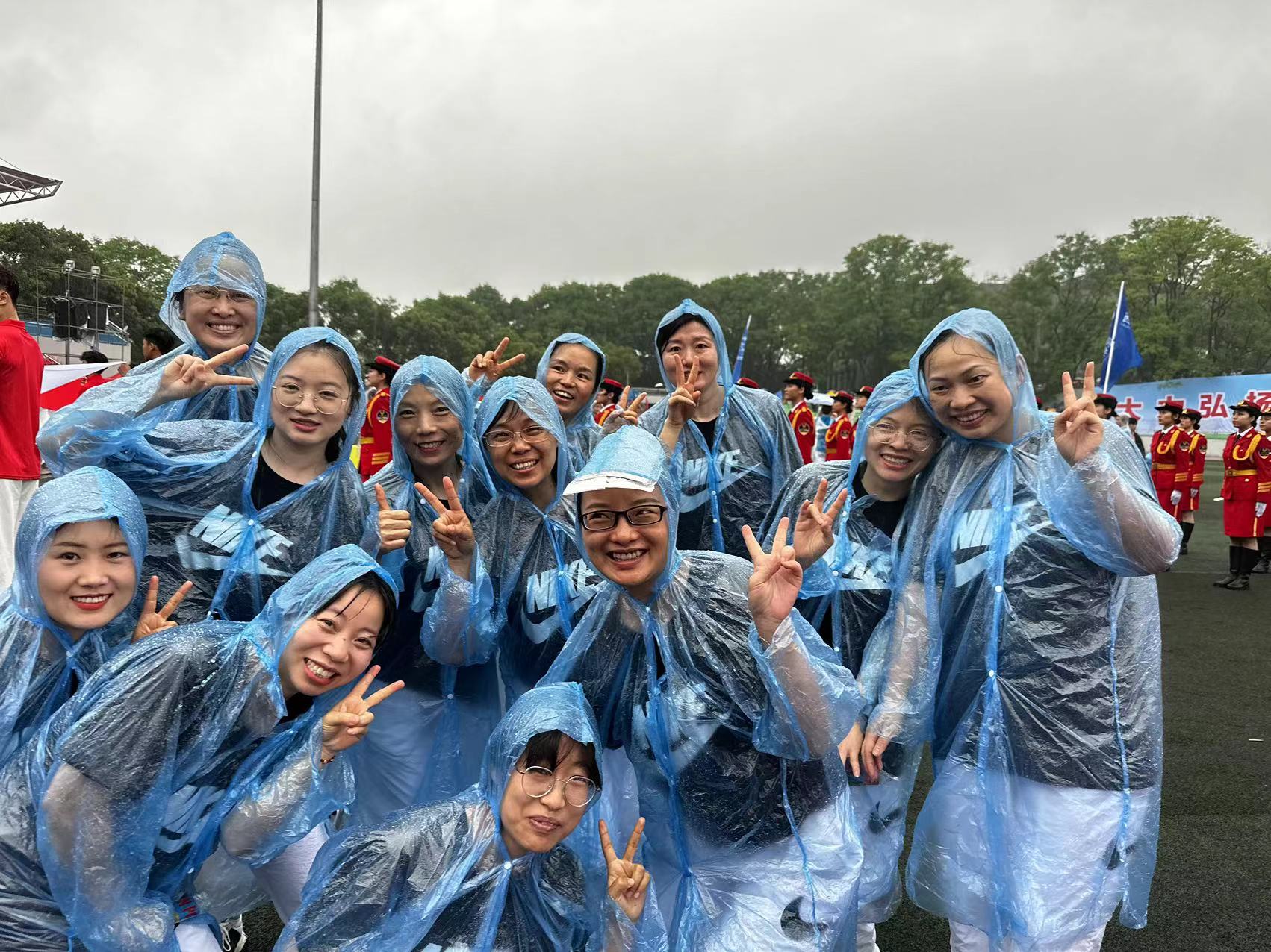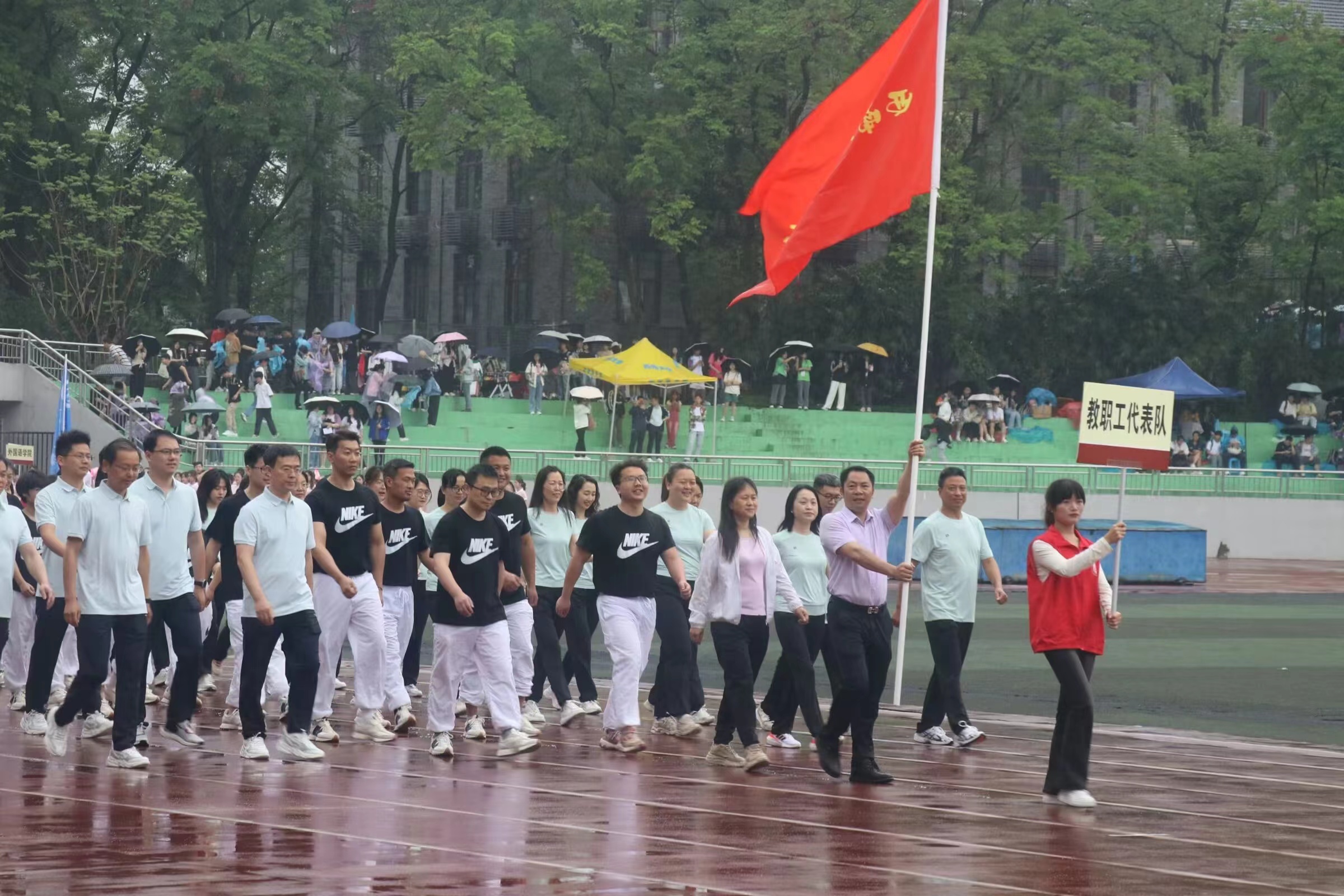 本次开幕式的教工方队由365上市公司(英国)集团、药学院和柑桔研究所三个单位组成。当天,虽天不作美,从清晨一直下雨,但老师们还是提前来到运动场集合。开幕式伊始,我院代表队迈着坚定的步伐,喊着铿锵有力的口号经过主席台前。他们不畏风雨、勇毅前行,传达了化学人勇攀高峰的精神和突破自我的坚定信心。