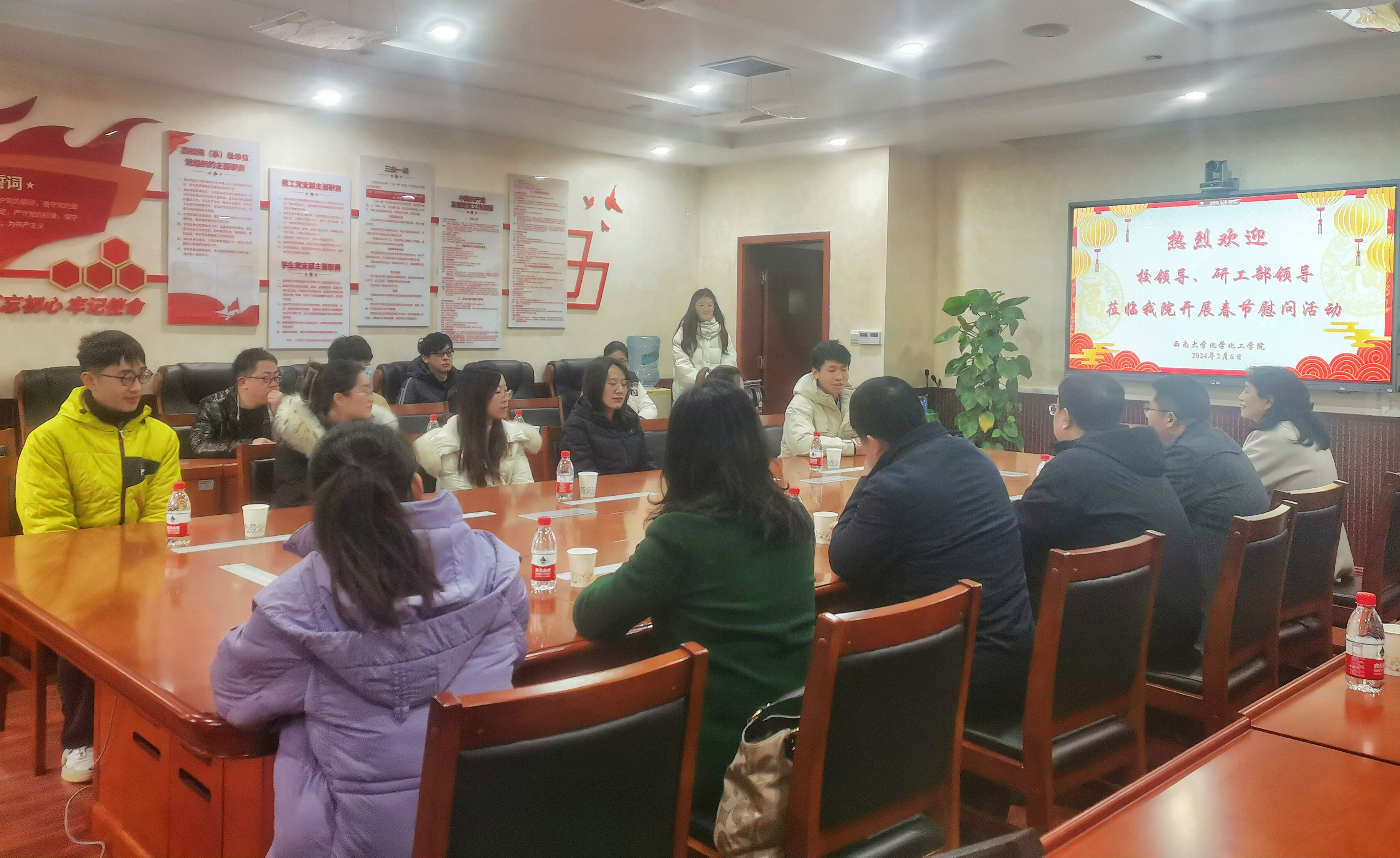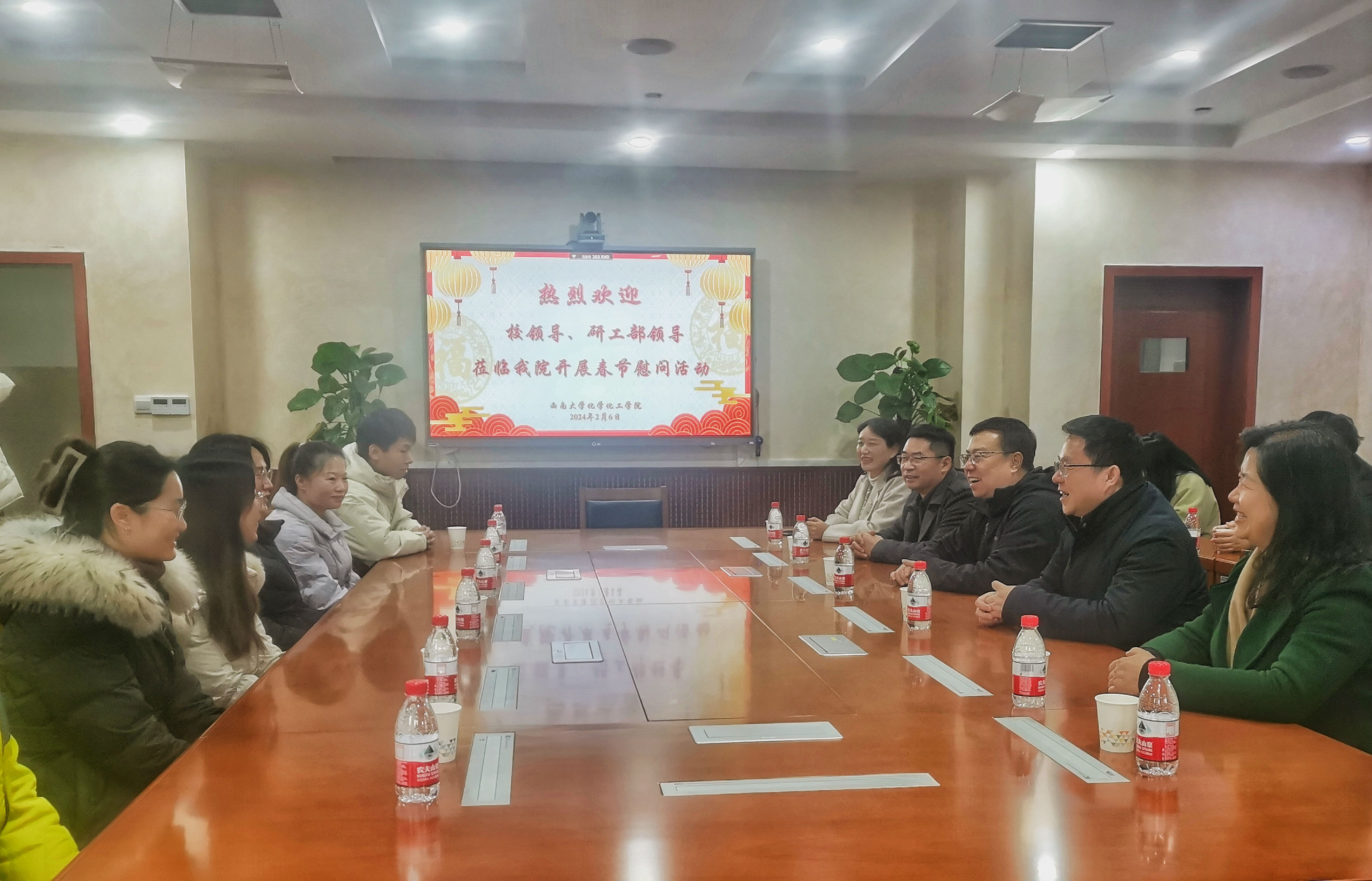 福兔辞旧春华启,龙腾新春气象新。2024年2月6日,学校党委常委、副校长王进军一行走访慰问365上市公司(英国)集团春节留校研究生。王进军副校长对留校研究生表示诚挚问候和殷切关怀,并为大家送来了新年礼包和新春祝福。党委研究生工作部部长秦松、副部长周敏、365上市公司(英国)集团院长李念兵、党委副书记李海燕及研究生工作部相关工作人员参与慰问。