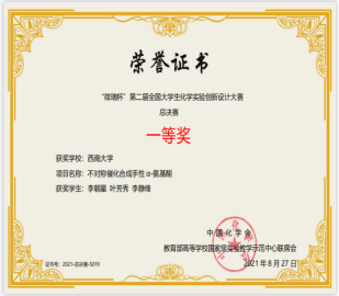 7月下旬由教育部高等学校化学类教学指导委员会和高等学校国家级实验教学示范中心联席会共同主办,四川大学承办的“微瑞杯”第二届全国大学生化学实验创新设计竞赛西南赛区决赛,来自四川大学、重庆大学、西南大学、云南大学、贵州大学等西南地区45所高校107支队伍参加了比赛。比赛通过线上评审,现场答辩等环节,我院三支队伍在开拓者小组赛中脱颖而出,分别以小组第1(西南大学3队:李朝星、叶芳秀、李静烽,指导老师,郭其祥、文巍)、第2(西南大学1队:孙源、贾安睿、余铭羽,指导老师,黄成、彭焕军和第5(西南大学2队:张雨萱、夏丹、谭海莹,指导老师,隆异娟)的成绩,均获得一等奖,也是唯一所有三支参赛队伍都获一等奖的高校。由于一个学校只能有一支队伍晋级参加全国总决赛,西南大学3队代表学校参加了8月下旬第二届全国大学生化学实验创新设计竞赛总决赛,与来自中国科技大学、浙江大学、南京大学、中山大学、天津大学、武汉大学、厦门大学、吉林大学、南开大学、四川大学等全国的90支队伍同台竞技,最终获得一等奖。