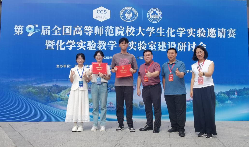 2025年7月13日至15日,第九届全国高等师范院校大学生化学实验邀请赛在东北师范大学成功举办。本次赛事由中国化学会和高等师范院校化学学院院长联席会共同主办,吸引了包括北京师范大学、华东师范大学在内的全国47所师范院校共94名学生参加。在此次比赛中,我院2022级师范专业郑伯峥、应用化学专业李子伊双双斩获大赛一等奖。